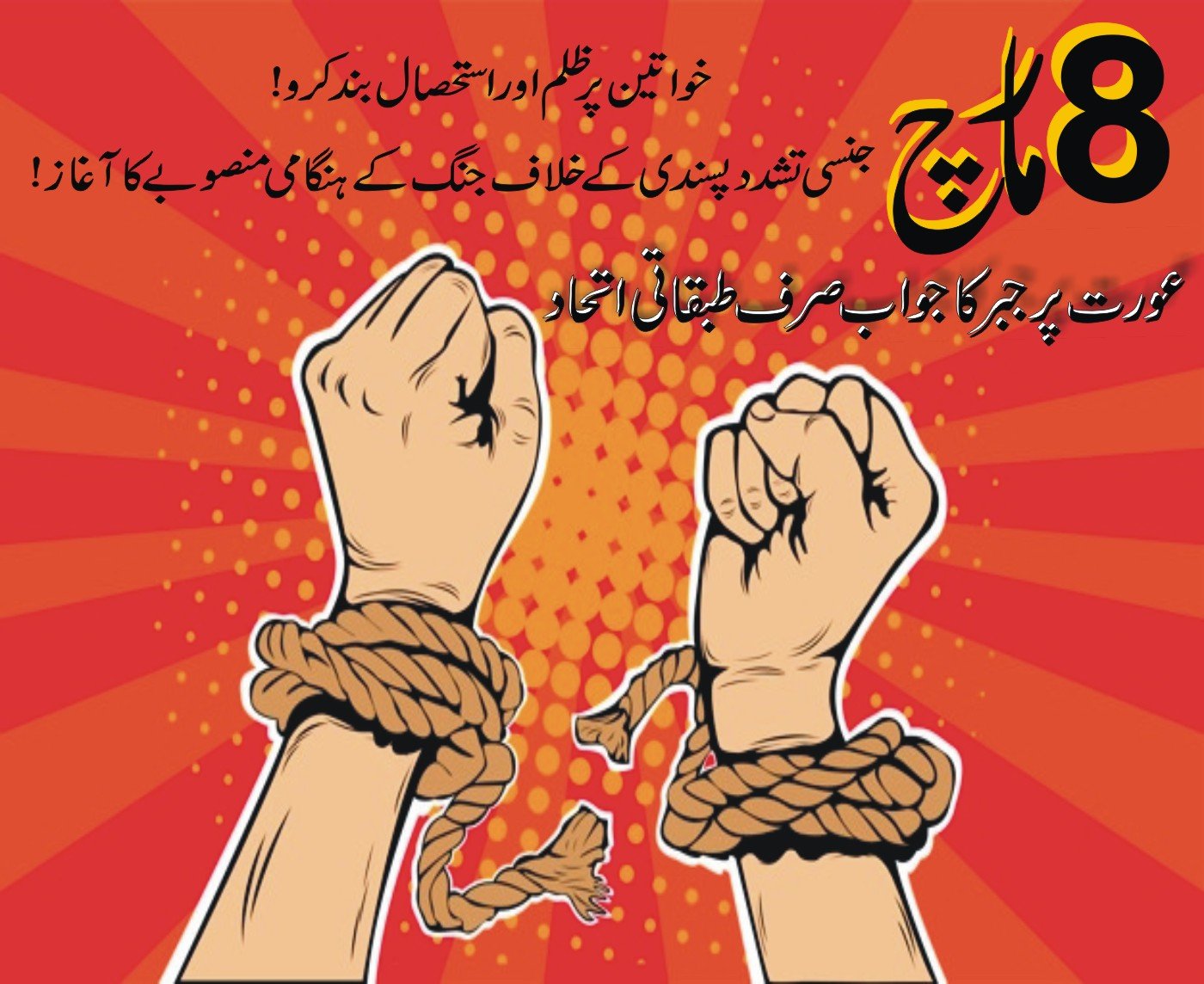 آئیے مل کر یہ عزم کریں کہ اس سال پیچھے ہٹنے کے بجائے، ہم اپنی پوری بڑھتی ہوئی طاقت کے ساتھ مذید آگے بڑھیں گے اور اس نظام کی پیدہ کردہ جنسی تقسیم کی شدیدمذمت کرتے ہوئے اپنے حقوق کے حصول کے لئے جاری جنگ کو آگے بڑھائیں گے اور تب تک جب تک اس فرسودہ نظام کو جڑوں سے نکال کر پھینک نہیں دیتے۔